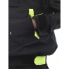 - Retractable hood in the collar. Fluorescent yellow lined hood with depth adjustment and tightening elastics + visor. Reflective tape.